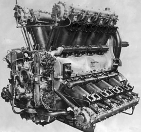 The four banks of four cylinders were arranged in a flattened ‘X’ when viewed from the front. The angle between the upper cylinders was 52.5 degrees, the lower cylinders 127.5 degrees which gave an angle of 90 degrees between the outer cylinder banks. The cylinders consisted of separate individual steel forgings with welded steel water cooling jackets. The carburettor was situated below the propeller reduction gear at the front of the engine and fed the inlet valves through four inlet manifolds. The valve drive gear, magnetos and pumps were fitted to the rear of the crankcase.
