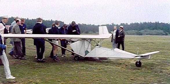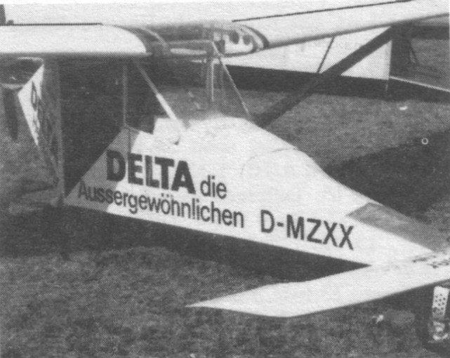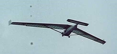 Single seat single engined high wing monoplane with conventional three axis control. Wing has swept forward leading and trailing edges, and tapering chord; no tail, canard wing. Pitch control by elevator on canard; yaw control by tip rudders; roll control by one-third span ailerons; control inputs through stick for pitch/roll and pedals for yaw. Wing braced from below by struts; wing profile Wortmann FX63 137; double surface. Undercarriage has three wheels in tricycle formation; no suspension on nosewheel and glassfibre suspension on main wheels. Push right go right nosewheel steering connected to yaw control. Brakes on nosewheel. Aluminium/tube/fabric fuselage, totally enclosed. Engine mounted at wing height driving pusher propeller.