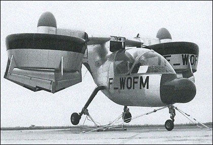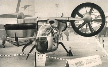The Nord 500 was a single seat, company funded research aircraft. Its mission was to evaluate principles of the Tilt Duct propulsion concept for VTOL aircraft. The enclosed cabin contained an ejection seat. Two 317hp Allison T63-A-5A (or Allison T63-A5T, or 250-C18, depending on the source) turboshaft engines were located side by side in the rear part of the fuselage. They drove two 1.5m diameter props through interconnected shafts. Moveable vanes in the propeller slipstream controlled the duct positions aerodynamically. There were no other mechanical controls for rotating the ducts. The ducts tilted, along with a short section of wing. During hover, control in roll was by differential thrust, while control in pitch was by collective tilting of the ducts. There was no provision for attitude control of the fuselage because the ducts pivoted freely. The intended top speed was 218 miles per hour.