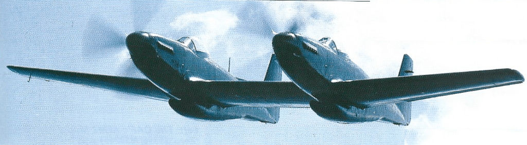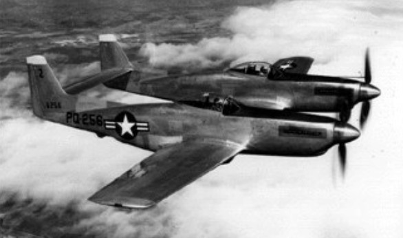 The long-range, high-altitude escort fighter, development of the P-51 Mustang, the Twin Mustang was formed by two fuselages joined by the wing and the horizontal stabilizer. The P-82 was a separate new design, not just a mating of P-51s, as commonly assumed. It was also the last prop-driven fighter to be ordered into production by USAF.