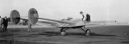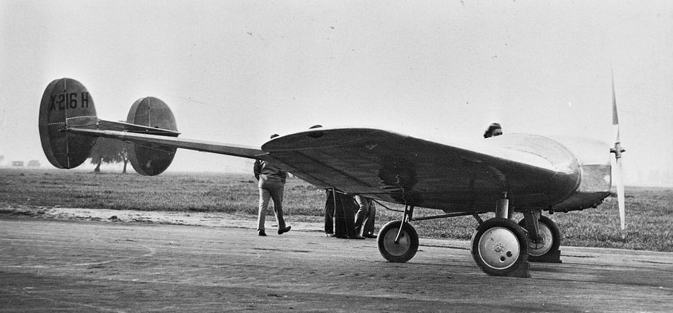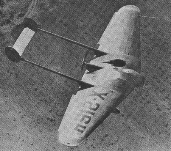 Jack Northrop in 1928 wanted to “do his own thing”, which was to start investigating all wing aircraft, He decided to keep a tail, for the time being. So the Northrop Flying Wing, with experimental registration X 216H, was intended to solve only some of the problems. The wing was a fairly conventional shape, apart from the thick centre section so that the pilot and passenger could sit comfortably inside it on each side of the centre line. The whole structure was a duralumin cellule with multiple spars and a stressed skin. To the rear projected an extremely, light pair of duralumin monocoque tail booms carrying a twin finned tail, the whole assembly weighing less than half as much as a conventional rear fuselage and tail. The main wheels were well forward under the leading edge, and under the trailing edge was a large steerable tailwheel.