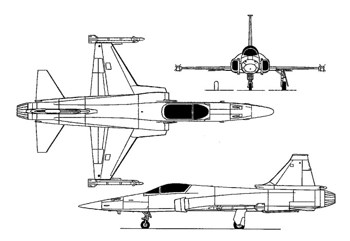 A much modified F-5E, the F-5G / F-20 has a General Electric F404-GE-100 low-bypass turbofan of 10,900 lb (4 943kg) dry thrust and 16,390 lb (7 433 kg) with afterburning, and an armament of two 20mm cannon and could carry up to 3175kg of ordnance on five stations. Three prototypes of the F-20, each embodying progressive improvements, were flown, these entering flight test on 30 August 1982, 26 August 1983 and 12 May 1984. A fourth prototype in the proposed fully-operational configuration was under construction when, following the October 1986 decision that an upgraded F-16A was to succeed F-4 and F-106 as the USAF’s air defence fighter, Northrop terminated further development of the F-20 and ceased marketing efforts.