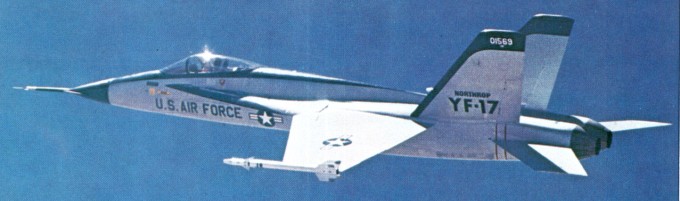 The YF-17 Cobra prototype (72-01569), the first of two for competitive evaluation against the General Dynamics YF-16, made its maiden flight on 9 June 1974. The second prototype made its first flight on August 21 1974 from Edwards AFB, California. These were powered by two General Electric YJ101-GE-100 engines rated at 6532kg with afterburning. Proposed armament comprised one 20mm rotary cannon and two AIM-9 Sidewinder AAMs, provision being made for one centreline and four wing stores stations to give the YF-17 multi-mission capability.