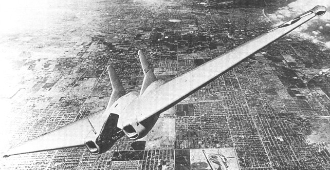 The engines chosen were the 19 inch Westinghouse Navy axials, which as the pre production J30 (model 19B) were each rated at about 1,150 1b / 619kg. This was judged enough to make the 8,670 lb XP 79B a practical proposition, and technically it was a design of exceptional interest. The pilot was accommodated in a modified cradle, stressed for sustained 12g manoeuvres, with an engine close on each side. To overcome the nose gear problem there was “a wheel at each corner”, each leg folding into the wing. After testing with no fin or with a central fin it was decided to fly with a fin above each jet. The aircraft that bore AAF serial 43 52437. It was delivered to Muroc in June 1945 to start testing with Harry Crosby as a test pilot.