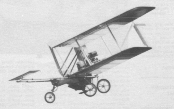 Single seat single engined biplane with two-axis control. Wings have swept back leading and trailing edges, and constant chord; no tail, canard wing. Pitch control by fully flying canard; yaw control by tip rudders between wings; no separate roll control; control inputs through stick for pitch and pedals for yaw. Wings braced by struts and transverse X cables; wing profile; double surface. Undercarriage has three wheels in tricycle formation; glass fibre suspension on main wheels. Push-right go left nosewheel steering independent from yaw control. Brake on nosewheel. Aluminium tube framework, without pod. Engine mounted between wings driving pusher propeller.