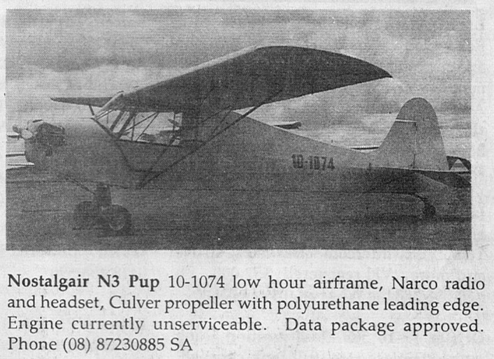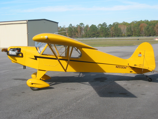 The original N-3 Pup being a ¾ scale Super Cub replica. Centre mounted joy stick, rudder pedals, tailwheel steerable through rudder pedals. The N3 Pup has a welded chromemoly steel fuselage and a two-cylinder horizontally-opposed Global engine to add to its air of authenticity. By 1995 marketed as the Preceptor Aircraft Corp Pup from 1230 Shepard St, Hendersonville, NC 28792, USA.