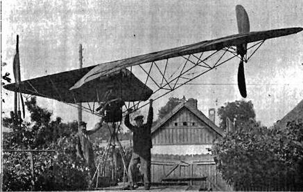 A helicopter with a rotor with two broad, propeller-driven blades, built by Ludwig Ös (or Oes) in 1910, in Bekescsaba in what is now Hungary.