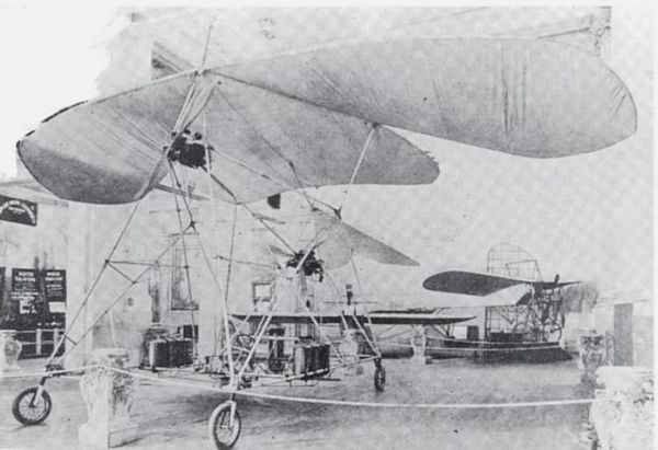 A monoplane equipped with two 50-horse power motors and two propellers. There are two blades in front and three in the rear. Built of steel tubing and aluminium, the machine weighed 1,000 pounds and had a stated carrying capacity of twelve persons. Designed and built by David A. Palmgren, as displayed at the Grand Central Palace Aero Exhibition, New York, in May 1912.