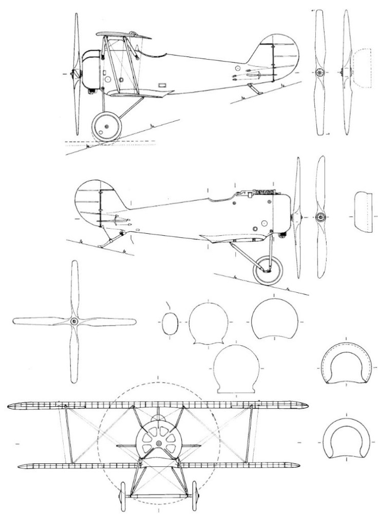 Behind the D.VII’s rotary engine its fuselage was of rounded cross-section, with the single-seat, open cockpit just below the upper wing’s trailing edge, where there was a small cut-out for better upward vision. The horizontal tail was mounted at mid-fuselage; the fin was straight-edged and carried a full, rounded and horn balanced rudder. The D.VII had a simple fixed conventional undercarriage, with mainwheels on a single axle supported at each end by a thin V-form pair of struts. There was a generous tailskid. The D.VII had a pair of fixed LMG 08/15 machine guns, the standard German single-seat fighter armament of the time.