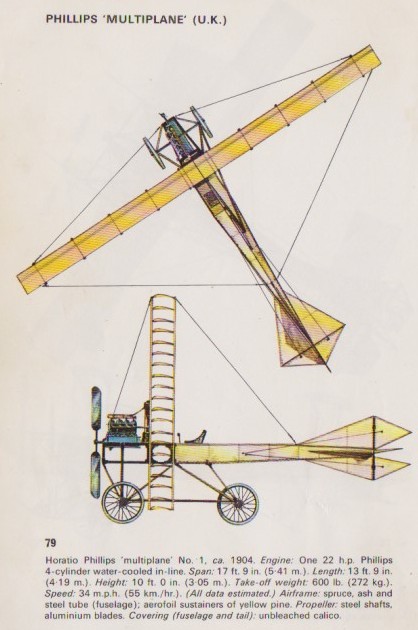 Phillips built his first man-carrying machine, with 20 lifting surfaces, in 1904, and was able to make at least one short hop of 50 feet. His 1907 machine had four banks of 50 wings each and an eight-foot propeller. In this machine Phillips made a powered, although uncontrolled, flight of about 500 feet.