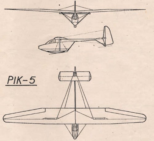 The PIK-5 was a training glider produced in Finland in the 1940s, and 1950s, equipping the country’s gliding clubs with an aircraft greater in performance than primary gliders but less than competition sailplanes. The aircraft had a pod-and-boom configuration, with a high, strut-braced monoplane wing and a cruciform tail carried at the end of a tailboom that extended from a position high on the aft end of the pod.