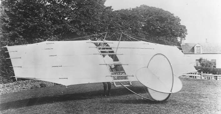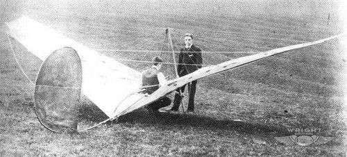 In 1893 Pilcher had been appointed assistant lecturer in Naval Architecture and Marine Engineering at Glasgow University, and it was there, inspired by Otto Lilienthal, that he designed his first glider, the Bat, in 1895 and tested it at Cardross. In 1896 he made his first glides, under Lilienthal’s tuition. This was the second form of Bat, with a bisecting circular fin and tailplane. Longer flights were made, some under tow when the wings’ dihedral was reduced.
