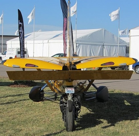 The engine pod carries a separate engine for road travel with its own fuel tank. The wheels are driven through an automatic transmission with a reverse gear. The lightweight fuselage coupled with a low power engine allows 25 miles per US gallon (9.4 L/100 km; 30 mpg imp) fuel economy with 5 US gallons (19 L) of usable fuel. The aircraft is registered in Washington State as a motorcycle due to its 3-wheel configuration.