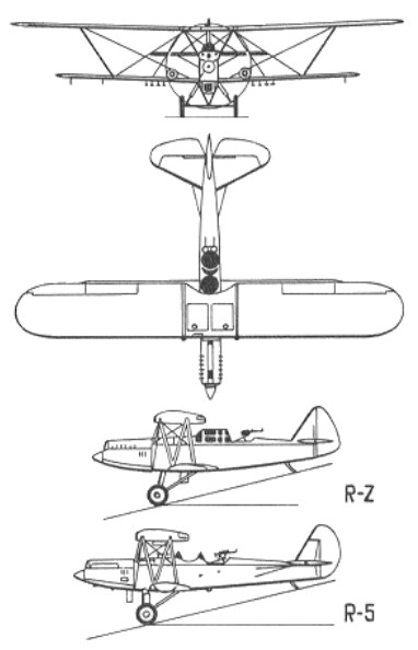 An unequal-span two-seat biplane constructed largely of wood with fabric covering, the R-5 reconnaissance light bomber flew in prototype form in 1928. Pilot and observer/gunner were seated close together in tandem open cockpits – the pilot beneath a cutout in the upper wing trailing-edge. The BMW VIb in-line engine of the prototype was replaced by the 507kW Soviet-built M-17B in production aircraft. The R-5 could operate on skis or twin-floats (the latter designated R-5A or MR-5), as well as on the more normal axle-type fixed undercarriage. Standard armament was a fixed 7.62mm PV-1 machine-gun and a DA-1 weapon of the same calibre operated by the observer. Up to 250kg of bombs could be carried on underwing racks.