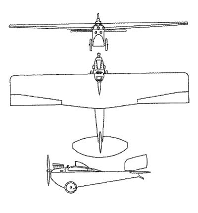 The aircraft is a monoplane with a 20 sq.m thick cantilever wing. The depth is 380 mm at the root, gradually decreasing towards the tips. The wing seen in plan forms a double trapezoid of 2.10 m chord at the root and 1.50 m at the ends.