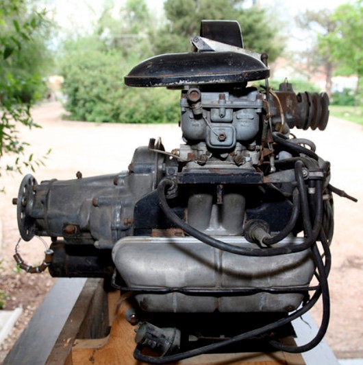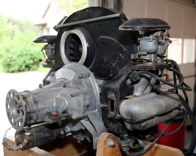 The engine differs from the car engine in many small ways, but its major departures are dry-sump lubrication, dual distributors (or magnetos, as an option) with dual spark plugs, different engine mounts, and a reduction gearbox to reduce propeller rpm to an effective range; gears could be specified as 1.46:1, 1.70:1, 1.98:1, or 2.12:1. A 12-volt electric starter and similar generator are fitted, the latter run off a dual v-belt. The external oil cooler uses a pair of 356 engine oil coolers on a special casting, and the dry-sump oil tank is connected to the pump by flexible lines. A rudimentary exhaust system piped gasses out of the fuselage.