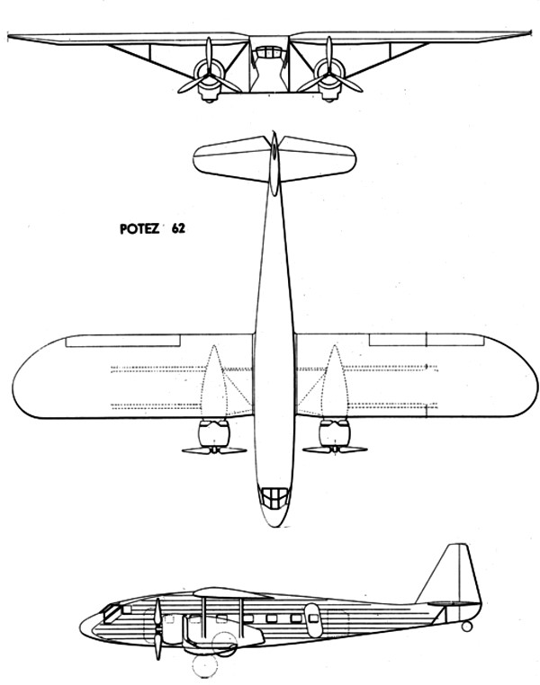 The prototype Potez 62 civil airliner, based on the military Potez 54, made its maiden flight on 28 January 1935. It retained the strut-braced high-set wing of the Potez 54, which was married to a redesigned fuselage. Pilot and co-pilot were seated side-by-side in a control cabin with, to their rear, two cabins accommodating up to 16 passengers. Undercarriage was retracting, but there were no flaps, which the large wing area with thick airfoil made unnecessary, at the expense of speed.