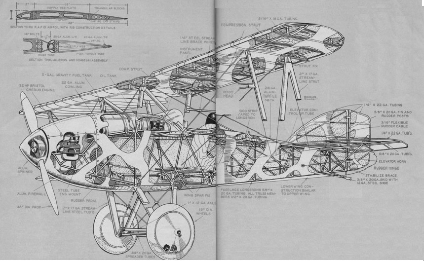 The wings have routed spruce beams with 1/16in ply ribs and 1/4in square cap strips. Streamline steel tubing was employed fir the interplane struts and the landing gear struts. Wing and landing bracing was 1/4in streamline steel wire. The engine was a Bristol Cherub.