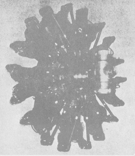 The master connecting rod has a solid instead of detachable cap big end for higher crank speeds. The single throw two-pice crahkshaft is divided into a forward and rear section. The crankpin is integral with the forward section which transmits power to the propeller hub carried by it. The rear section telescopes into the crankpin and is carried completely through it. The two sections are united by a through bolt and kept in the proper angular relation by splines.