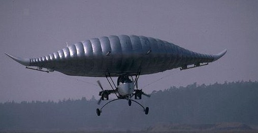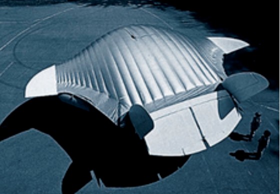 The media talked about a “flying stingray” when Prospective Concepts AG finally unveiled its secretive technology demonstrator in May 1998. Stingray is designed by this Swiss company, with a wing that derives its rigidity from compressed air. Later versions will be filled with helium. The second radical concept developed especially for the Stingray is a pneumatic catapult to be placed in the aicraft’s tail. The concept has been tested on the “Kangarou,” a light airplane with slow flight characteristics similar to the Stingray’s: a cylinder that extends to 5 meters catapults the craft right into the air and accelerates it from standstill to flying speed at 1.5 g.