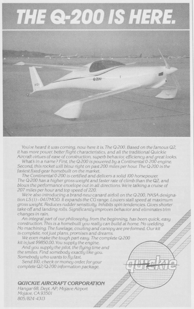 Quickie Aircraft Q200 Gallery 22/03/2025Terry Back to Quickie Aircraft Q200 Nov 83 Share this: Share on X (Opens in new window) X Share on Facebook (Opens in new window) Facebook Like Loading... Related