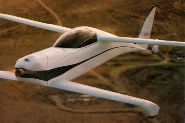 Developed around a heavy but durable modified industrial en¬gine, the prototype was designed and built in less than three months and returns incredible performance figures for its minimal power: 201 kph (125 mph) cruise speed and 145 km (90 miles) on a single gallon of fuel. It has no tail surface, just a pair of sharply staggered wings with wheels set into the tips of the lower wing.
