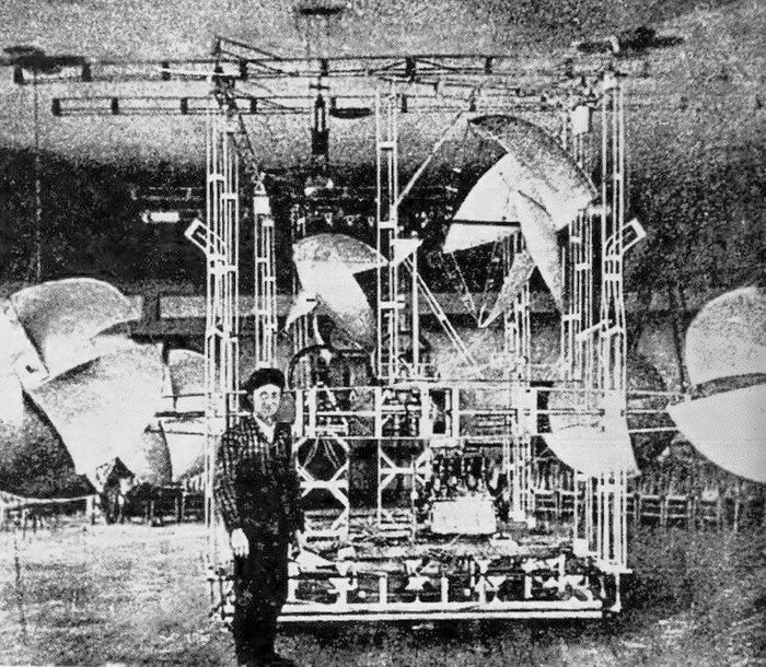 A contrivance consisting of two major parts, a cigar-shaped balloon, to which was attached a frame, on which were six propellers. Four propellers were used for ascending and two for steering. The power was supplied by a gasoline engine. The Streator, Illinois inventor declared that his ship could be driven from Chicago to New York at the rate of 100 miles an hour, and that it could be sailed around a tower with its side touching the structure at all times. It was planned to construct the machine at an expense of $ 10,000.
