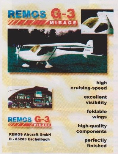 First flown in 1997, the Remos was introduced in 1998 and proclaimed Aircraft of the year at the biennial AERO sport aviation show in Friedrichshafen, Germany, in 2000.