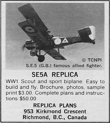 The prototype flew in Canada in 1970 and there were two flying in New Zealand with at least two more under construction. The wooden wing has a leading edge covered with either fibreglass or aluminum, the rest being fabric-covered. The plywood-covered box fuselage has a fabric-covered turtle-deck and aluminum-covered forward section. Performance from an 85 hp powered SE-5A Replica are a cruise speed of 135 km/h and 150 m/min climb rate.