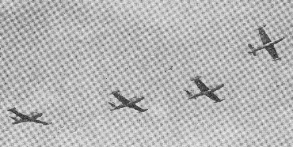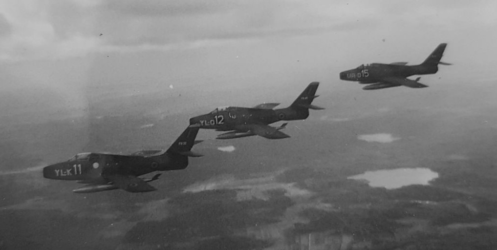 Three of the five Belgian F-84F Thunderstreaks participating in the 1959 PAIM, flying over Sweden. The 11 and 12 are from the 3rd squadron (YL-K / FU-32, YL-O / FU- 27, the 15 is in the colors of the 2nd (UR-O / FU-?).