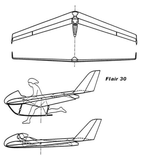 The Flair 30 was a follow-up to the Flair design and first flew in 1990. The pilot could launch by foot, then lay prone in a special harness, and finally land on a skid. After extensive test flights, including more than 50 hours logged by test pilot Knut Von Hentig, the prototype was destroyed in a crash at a sailplane club, when the sailplane pilot flying it dove into the ground at high speed from less than 100 m. Control reversal was suspected but unproved.