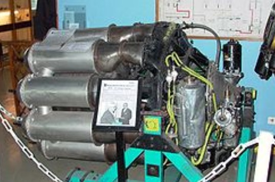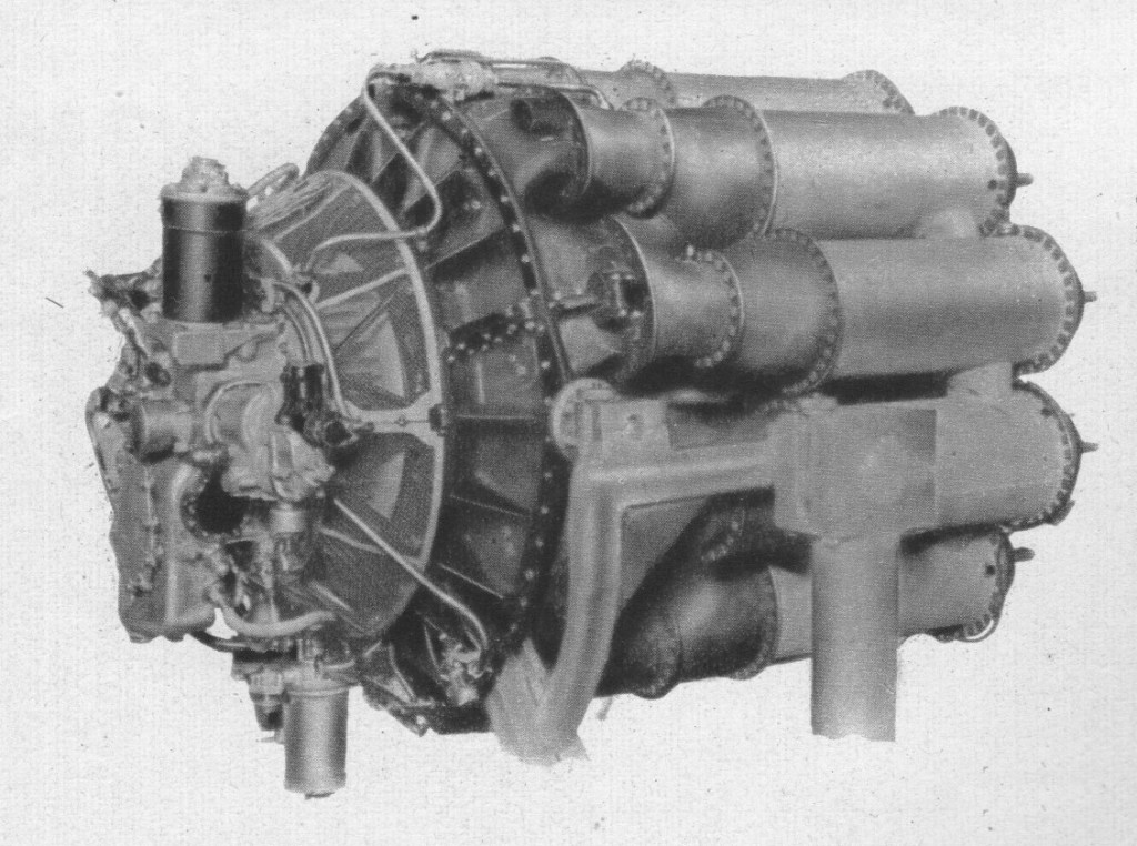 The W.2 was basically a larger version of Whittle’s original flying design, the Whittle Supercharger Type W.1, or simply W.1, which flew in 1941 in the Gloster E. 28/39 experimental testbed aircraft. The engines used a single double-sided centrifugal compressor, or impeller, with the compressed air being taken off at several ports around the extreme outer edge of the compressor disk. They both used Whittle’s “reverse flow” design, in which the flame cans (combustion chambers) were placed around the turbine to produce a shorter engine. This required the heated air to flow forward before reversing its direction to pass through the single-stage axial-flow turbine. For the W.2, the impeller was 19 inches (480 mm) in diameter and there were ten flame cans. Air was bled from the compressor and fed into the inner portion of the turbine for cooling. The entire engine weighed about 850 pounds (390 kilograms).