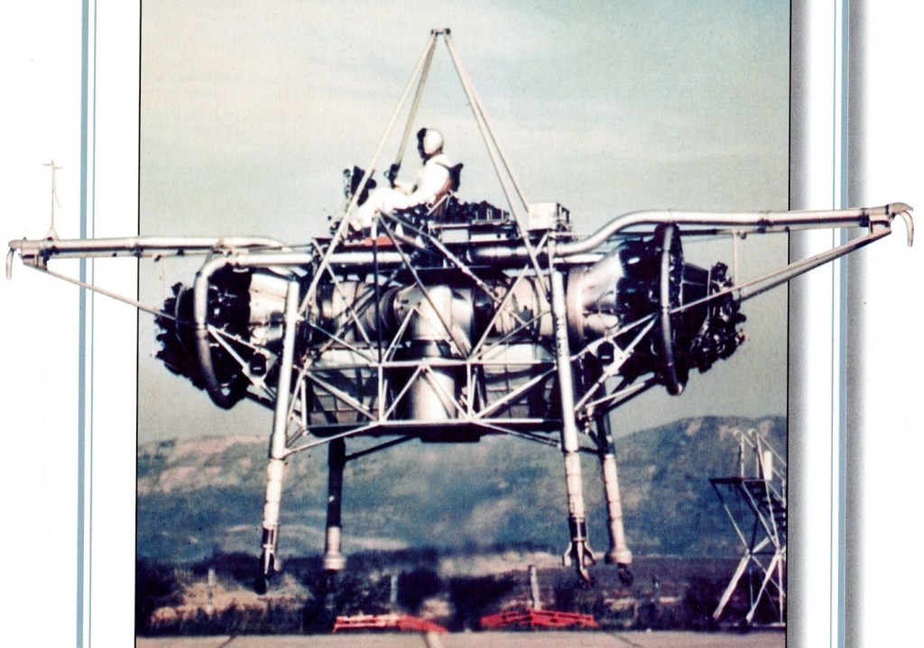 Its pilot sat on a control station atop an entirely open-air framework of tubing, a calliope of ‘puff-pipes’ for attitude control arranged all around him. It was nicknamed the ‘Flying Bedstead’. NASA were interested in its reaction control system for their lunar lander simulator.