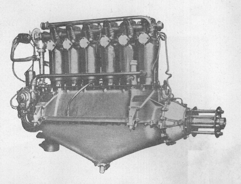 Originally intended for use in training aircraft, this engine became far better known as the power-plant of Naval airships. It was designed, in 1915, for an output of 75 h.p. at 1,350 r.p.m., but ratings soon increased. In February 1916 it was giving 91 h.p.; in October 1918, 94 h.p.; and later in the same month, at 1,500 r.p.m., 105 h.p.