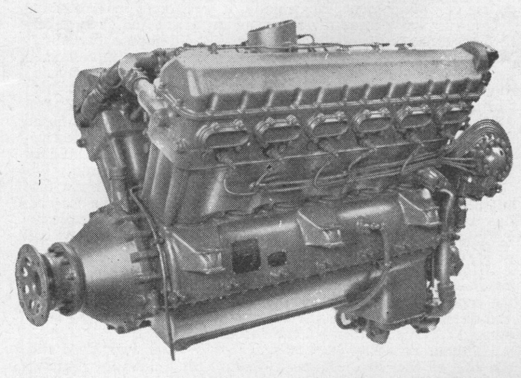 The year 1925 saw the beginnings of a new engine which differed radically from its forebears in having each of the two banks of six cylinders formed from a single aluminium-alloy block. Of 21.24 litres capacity, it was of compact design and first appeared, under the designation F.10, as a direct drive unit. During June 1927 Flight was able to announce that the F.10 had completed its official 100 hr type test at the first attempt, and had been granted a Certificate of Airworthiness. The maximum b.h.p. was 490 at 2,350 r.p.m. and the fuel consumption, at normal power and speed, 30 gal/hr. Dry weight was 760 lb.