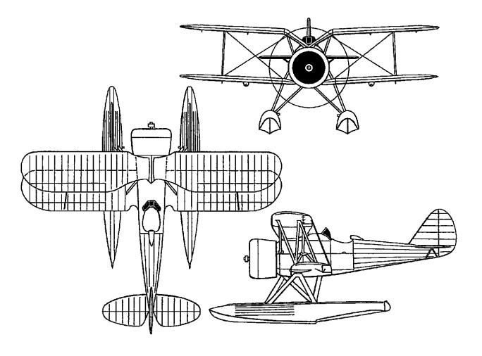Powered by a 720hp Hispano-Suiza 9Vbrs nine-cylinder radial, the R-90 was flown in August 1935, attaining a speed of 352km/h at 3500m. During the following October, it was re-engined with a smaller-diameter 14-cylinder HS 14Hbrs two-row radial enclosed by a longchord NACA cowling. At the same time, the volume of the floats was increased and more substantial floatbracing struts were provided.