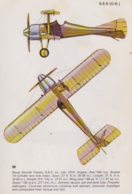 1914 Scout. At the Royal Aircraft Factory H. P. Folland’s S.E.4 scout set up an unofficial world speed record of 131 m.p.h. with a 160-h.p. Gnome. Its engine was fan-cooled; the variable camber wings could be used as landing flaps; and it had a celluloid cockpit cover, an N.A.C.A. cowling, single I type wing struts, streamlined bracing wires, and fairings on its axle and wheels and over the aileron, elevator and rudder gaps. Other engines were also fitted.