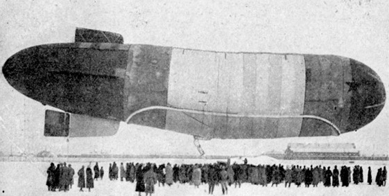 Designed by General Nobile, the second Russian airship was “VI October”, which was built of makeshift materials in 1923 by students of higher forces aeronautical school located in St. Petersburg. The envelope of 1,700 cubic meters was sewn from old tethered balloons. The total length of the airship was 39.2 m and width 8,2 m. The engine was 77 kW.