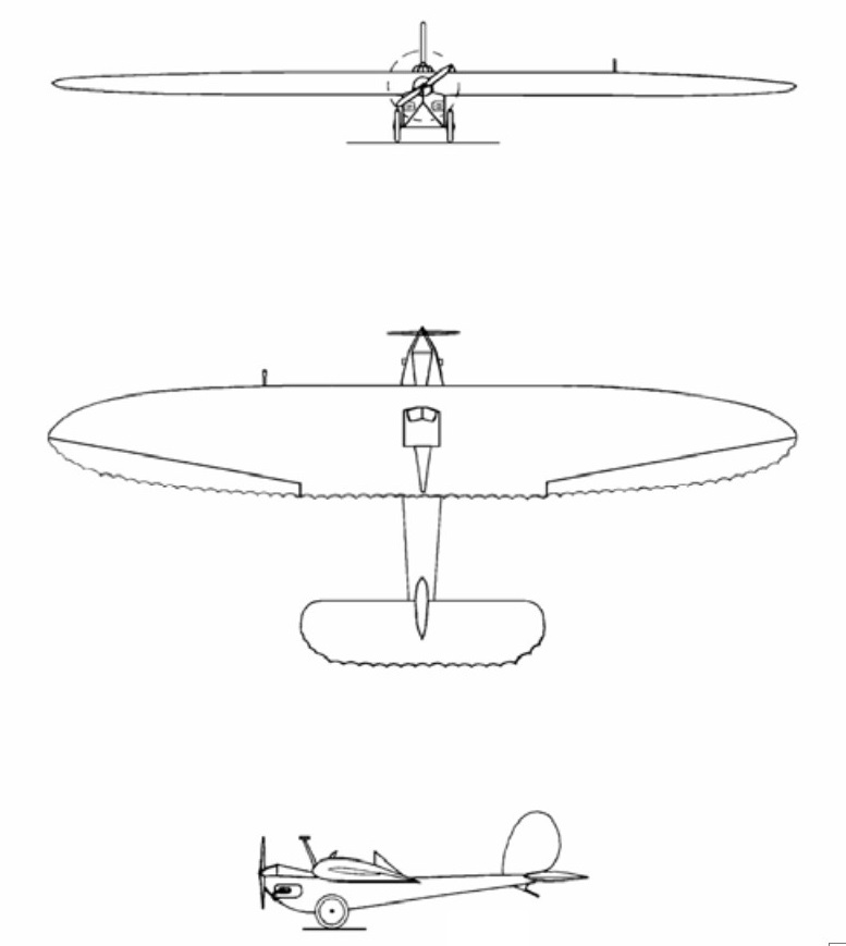 A small 494 cc “Douglas” engine was fitted for its development period. The propeller required a chain reduction gear which absorbed 15 to 20% of its already low power of 5 CV.