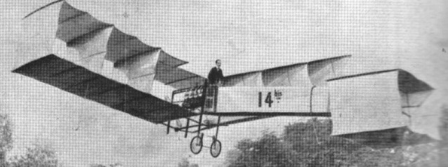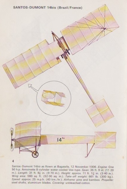 Before his next flight Santos-Dumont modified the 14-bis by the addition of large hexagonal ailerons, to give some control in roll. Since he already had his hands full with the rudder and elevator controls (and could not use peddles since he was standing), he operated these via a harness attached to his chest. If he wanted to roll right he would lean to his right, and vice versa. One witness likened Santos-Dumont’s contortions while flying the 14-bis to dancing the samba.