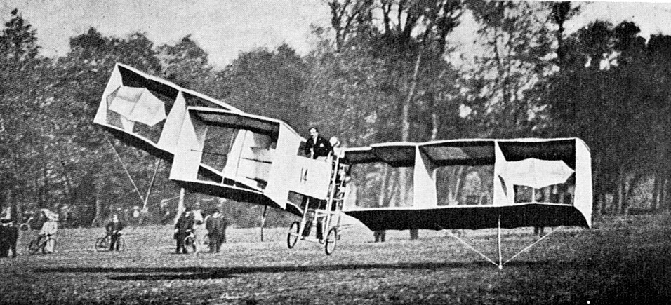 In 1906, Santos-Dumont took the nacelle of his dirigible balloon no. 14 and added to it a fuselage and biplane wings. An Antoinette V8 engine of 24 hp power was installed ahead of the wings, driving a propulsion propeller; the airplane flew rear-first and was denominated 14-bis (since it was descendent of the dirigible balloon no. 14). Santos’s entry was his No. 14bis, with a 12 m span wing consisting of six box kite cells joined in sharp dihedral. Another cell, which could be tilted up, down, or sideways for steering was mounted at the very front of the fuselage in canard configuration. Santos planned to fly the machine from a standing position just in front of the wing. His first tests were con¬ducted in typically bizarre fashion. Santos rigged up a tightrope and pulley contraption from which he suspended the machine, then hired a donkey to tow it back and forth while he tested the controls.