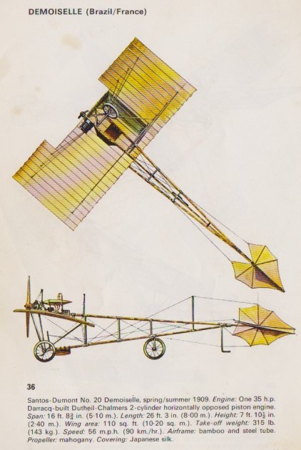 The original Santos-Dumont Demoiselle is said to have supported 260 pounds on 100 square feet of area, making a speed of sixty miles per hour. Its proprietor was the first aviator in Europe of the heavier-than-air class.