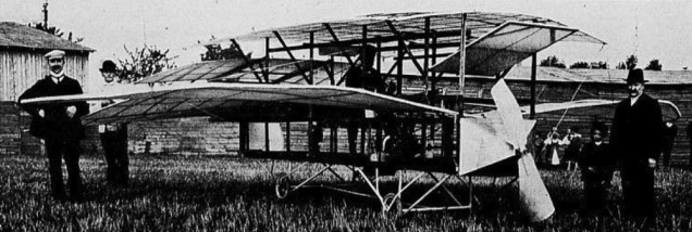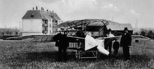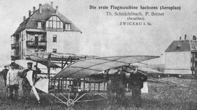 The first Flugmaschine in Sachsen, Germany, in 1909. It was a mixed version of a Schwingenflieger and a Gleitflieger, as the wings could flap but there were also two (tandem) wings fitted above the open fuselage. The elevator in the front was an ‘all-flying’ construction and the rudder is at the back. Total wing area is 40,10 square meter. The engine of 10 hp (due to be upgraded to 25 hp) drove the propeller at the front of the fuselage. Total weight (empty) of the machine is 335 kg, span is 9 meter and length 7 meter. Height is 2,20 meter.