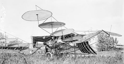 James F Scott’s 1910 smaller craft looked like a helicopter, but wasn’t. It consisted of an open structure bearing two V-frames on which 16 discs were mounted in fore and aft V-frames. The 8′ diameter disks were built of radially ribbed fabric, like umbrellas. There was no drive-shafting or other driving mechanisms for the disks, but a 40hp water-cooled engine drove a pusher propeller. Apparently, the disks were supposed to produce some form of lift. It is not known if the contraption was ever flown.