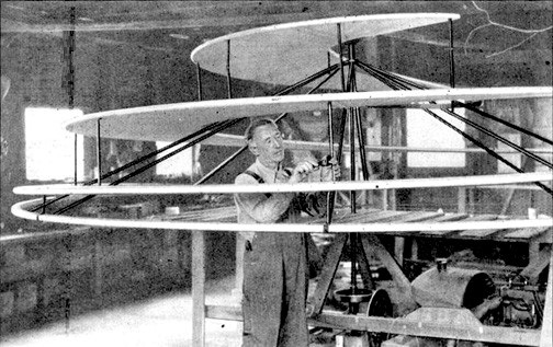 According to the 1932 photo and its press release, this was to be some form of an autogyro with a “large clutch-operated disc” (the spiral “lift”) arrangement. The caption explains: “Runways and landing fields will not be necessary if this creation of J P Sellmer works out. When the motor is started, the lift is started whirling to raise the ship straight up. When the right elevation is reached, the spiral folds up and the engine drives the plane as does any other. In large ships, two spirals are to be provided to eliminate torque, and in small ones, a propeller at the back of the plane will prevent spinning.” How far this grand idea progressed is unknown.