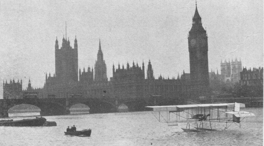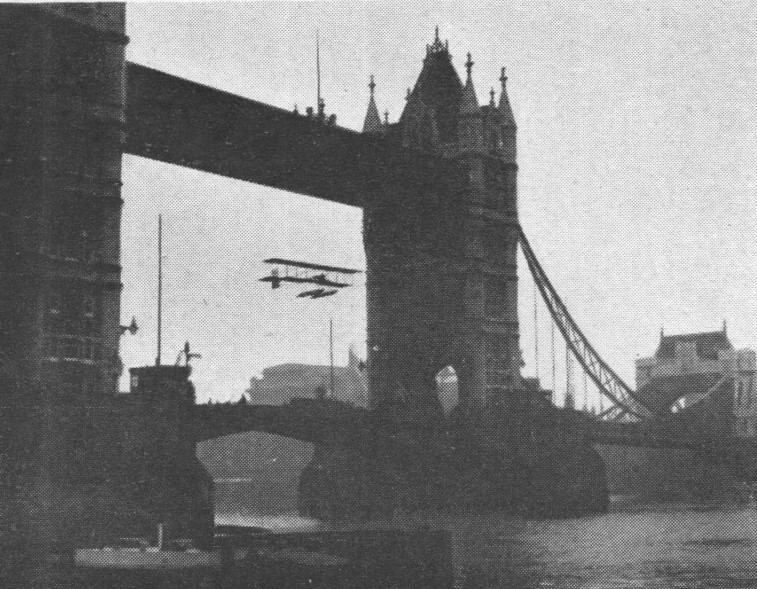 Frank McClean caused a sensation on 10 August 1912 by flying his Short biplane through the Tower Bridge, and then hopping and taxying under the remaining bridges to Westminster, where he alighted. Reprimanded by the Police, he promised not to leave the water again until he had taxied down-river, past Tower Bridge. When he attempted to take off, he crashed.