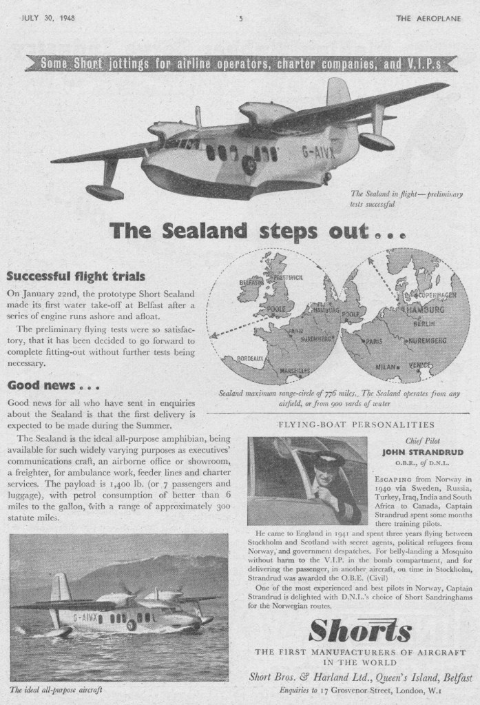 The Sealand twin-engined light commercial amphibian flying-boat was first flown on 22 January 1948. Power was provided by 254kW de Havilland Gipsy Queen 70 engines and accommodation was for five to eight passengers. Only a small number were produced, including three for the Indian Navy.