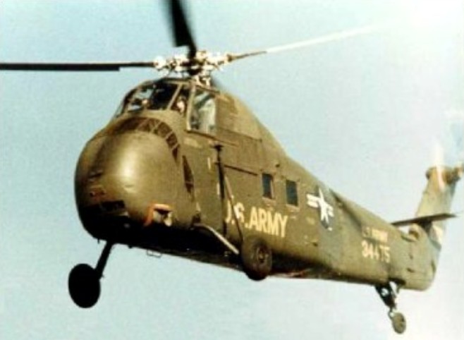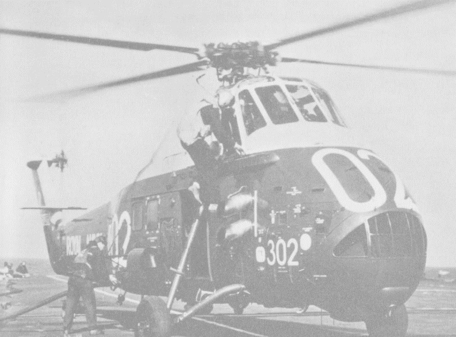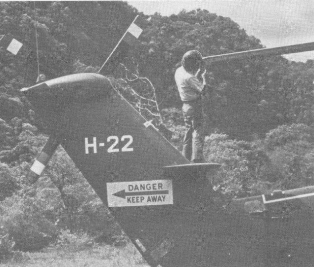 Following a tree-strike while landing at Ban Na Coke, the Air America crew-chief climbs up to inspect the damage to the rotor blades.