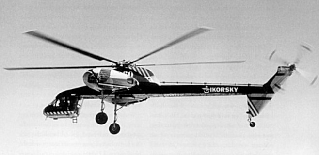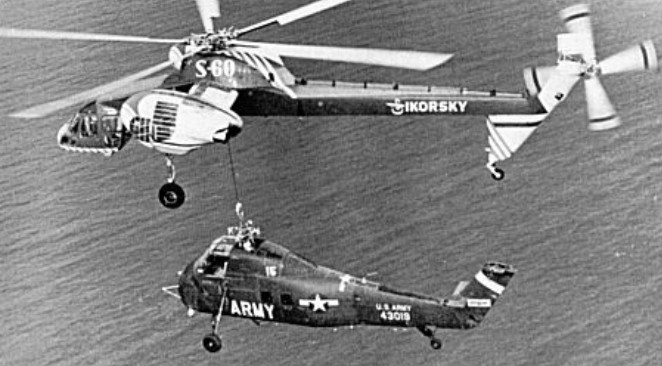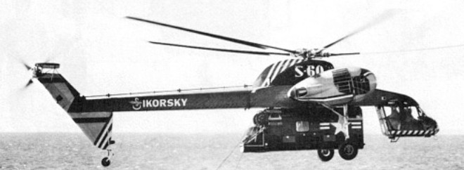 One S-60 was built for Navy evaluation, first flown on 25 March 1959, the craft was found to be underpowered for its intended roles. The prototype S-60 crashed in April 1961, but by then Sikorsky had begun construction of an enlarged version, with a six-bladed main rotor driven by two 3020kW JFTD-12A turboshaft engines. Designated S-64, the prototype flew on 9 May 1962.