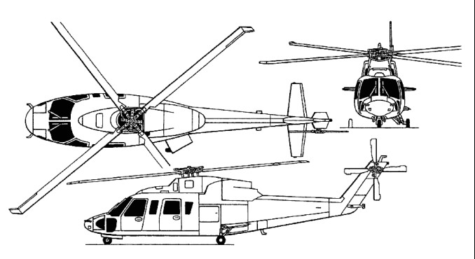 From the outset, the aircraft was equipped for all-weather operation, as one of its main roles was intended to be the servicing of offshore oil rigs. The four-blade rotor of this air craft is exactly like that of the S-70. The blades are built around a strong titanium spar; the leading edge is also titanium, while the trailing edge has a fiberglass and nylon honeycomb structure. The entire blade is pressurized for maximum structural integrity. The rotor hub is made according to the latest techniques to minimize maintenance: the normal bearings have in fact been replaced by elastomeric ones needing no lubrication, and special dampers virtually eliminate vibration. The powerplant is installed above the fuselage behind the drive shaft and consists of two 650 shp Allison 250-C30 turbines. There is a single 1030 litre fuel tank in the fuselage, but supplementary fuel tanks can be carried for longer journeys.